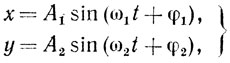 Более сложные траектории получаются при сложении колебаний в двух взаимно перпендикулярных направлениях. Примером такого колебания может служить движение тела, изображенного на рис. 86. В этом случае вид траекторий зависит от соотношения частот, амплитуд и фаз взаимно перпендикулярных колебаний.
